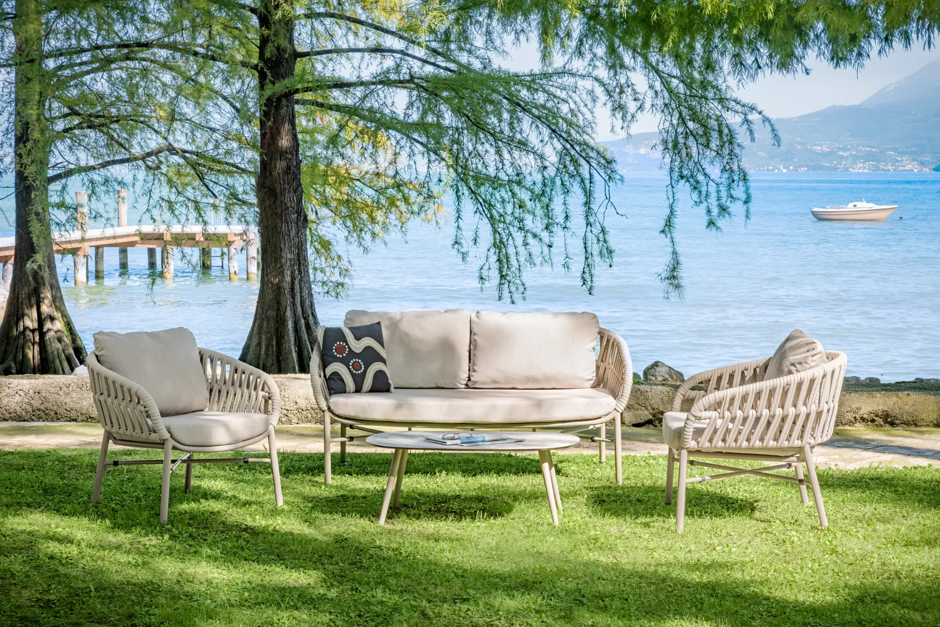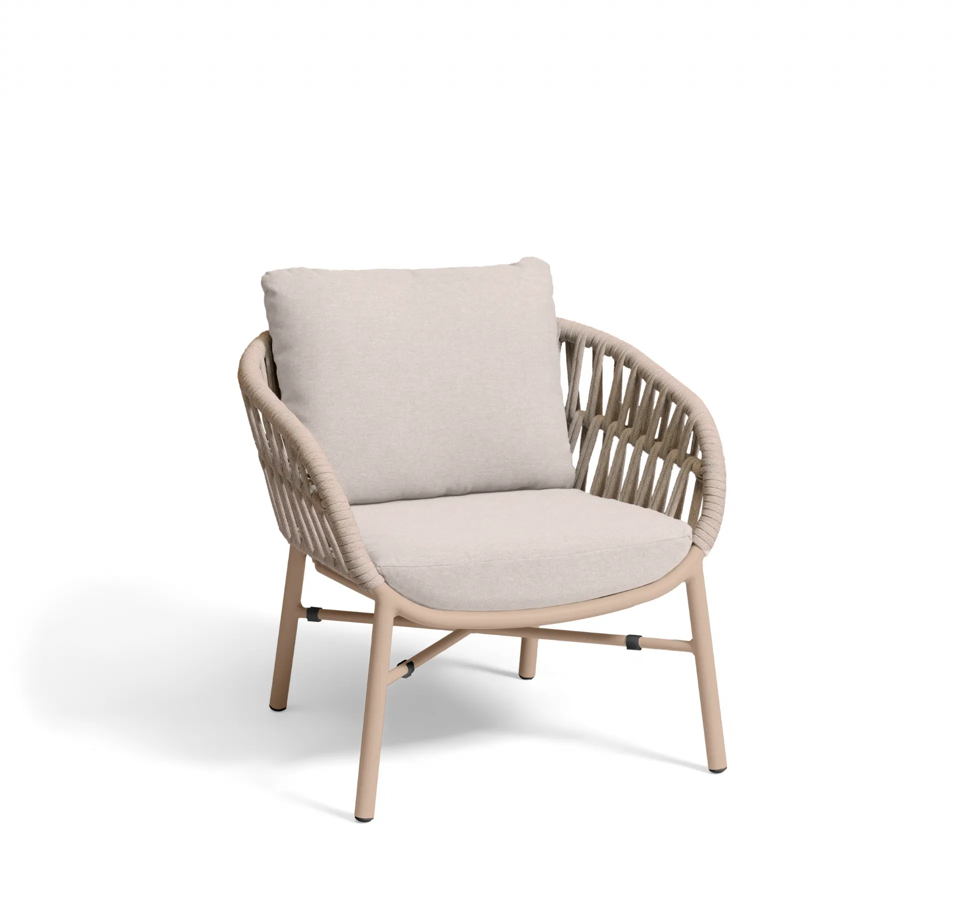 La poltrona Manila ecru è costruita su una solida struttura di alluminio verniciata a polveri di poliestere. Gli schienali sono rivestiti da una corda sintetica 12mm intrecciata a mano, la cuscineria è in tessuto PVC, sfoderabile. Il cuscino di seduta ha un'imbottitura drenante. Disponibile nelle combinazioni: Bianco/Silver, Antracite/Antracite, Ecru