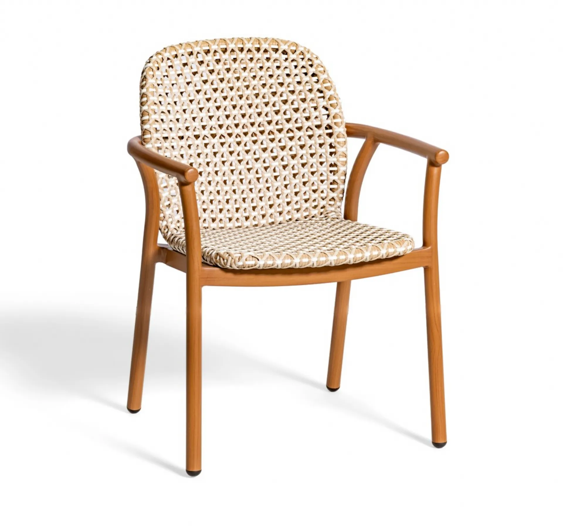 Poltroncina con telaio in alluminio verniciato effetto legno, schienale e seduta rivestiti da un intreccio in PVC.