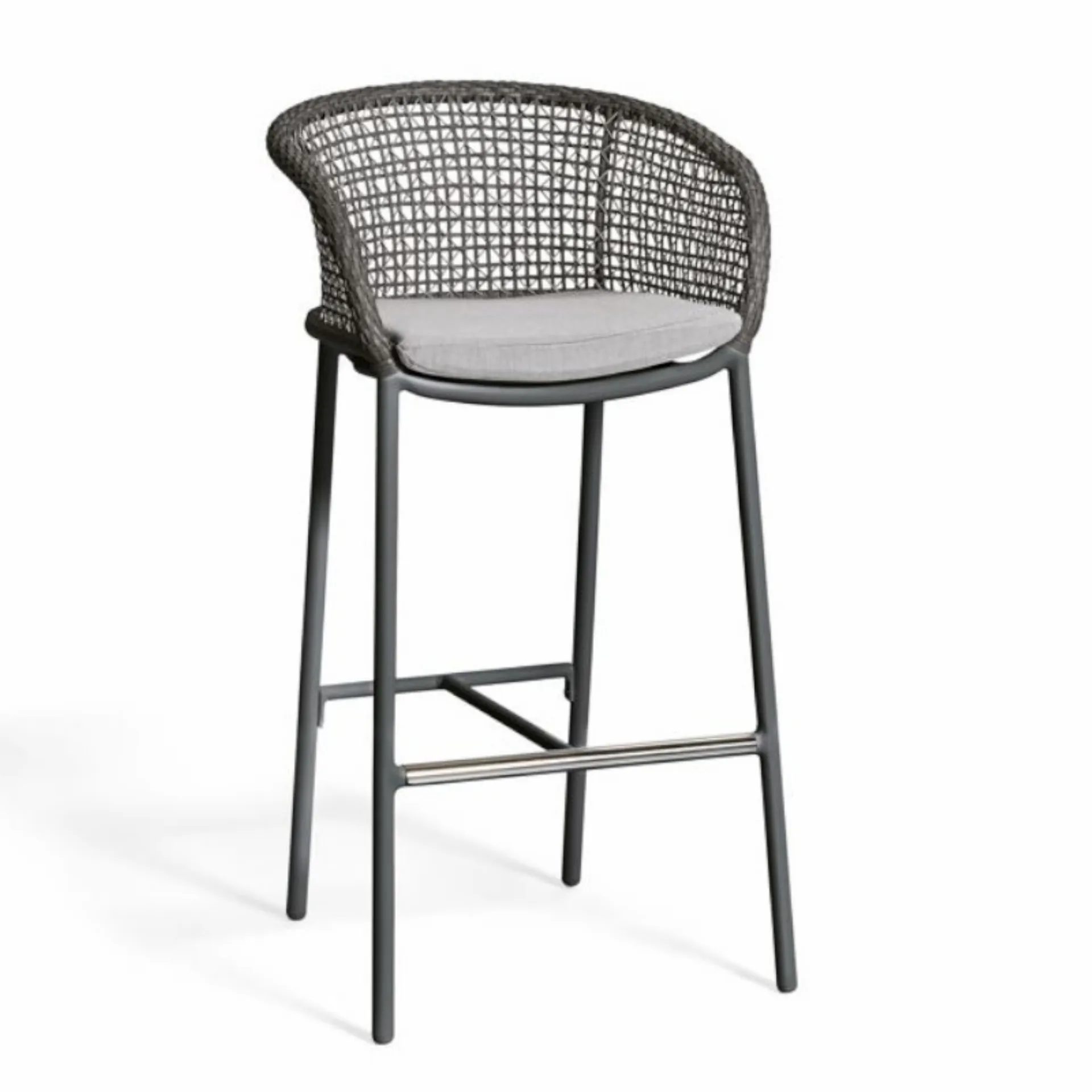 Sgabello con telaio in alluminio verniciato a polveri di poliestere, schienale rivestito da un intreccio in PVC a due colori. Il cuscino è in tessuto PVC, con imbottitura drenante e sfoderabile. Il poggiapiedi è rivestito in alluminio anodizzato.