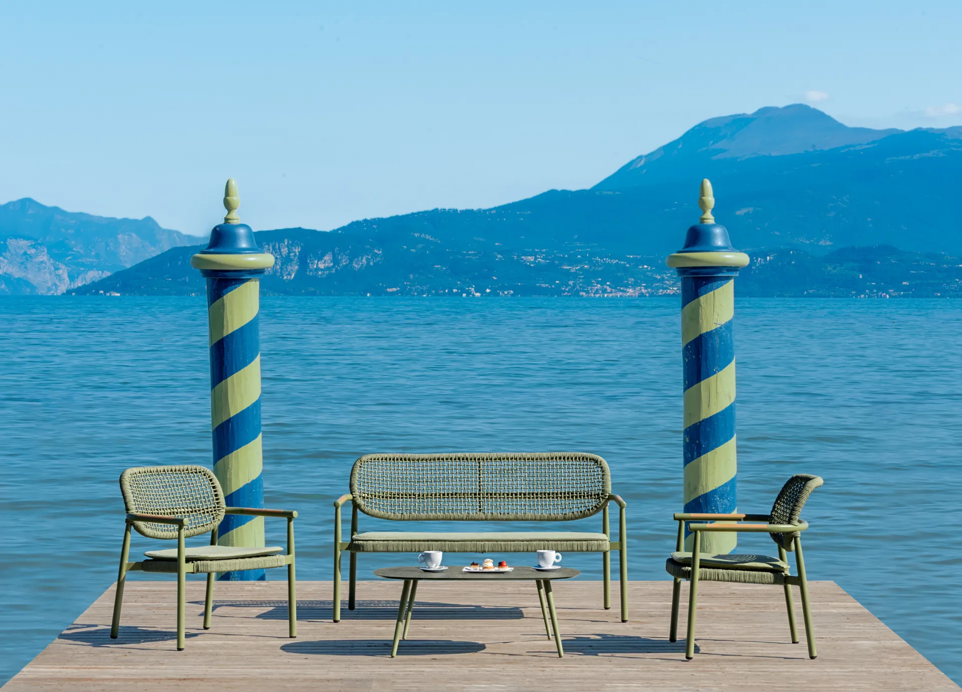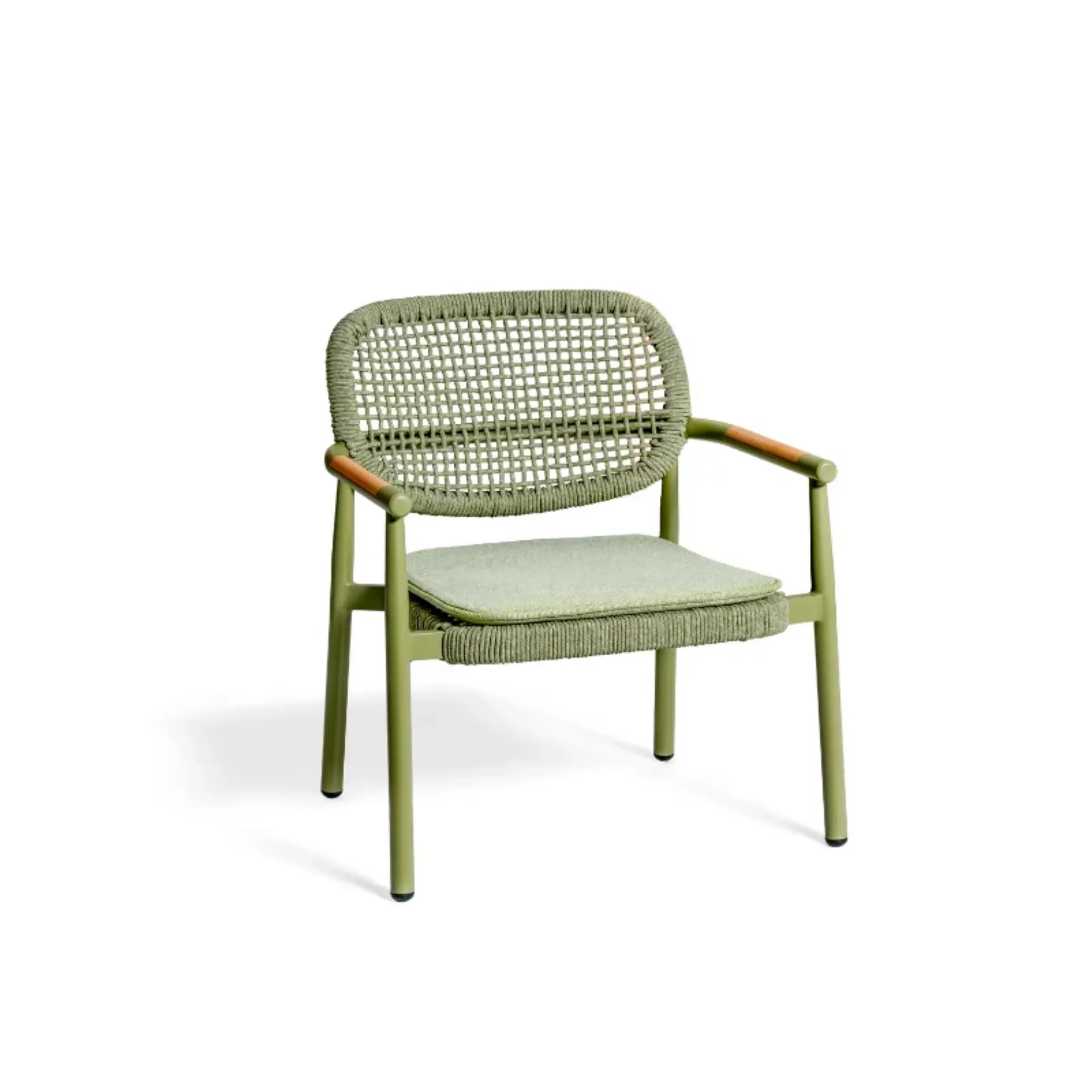 Poltrona con telaio in alluminio verniciato a polveri di poliestere, schienale e seduta rivestiti in corda sintetica intrecciata a mano. La cuscineria è in tessuto 100% poliestere, sfoderabile. Inserti su braccioli in Tech-no Wood.
