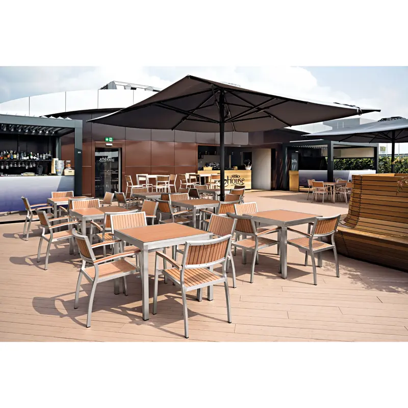 Le sedute e gli schienali sono in Tech-no wood, materiale plastico innovativo che, oltre all’aspetto simile al legno, possiede numerosi vantaggi per l’uso quotidiano: robustezza, facile pulizia, elevata resistenza agli agenti atmosferici e durabilità nel tempo.
