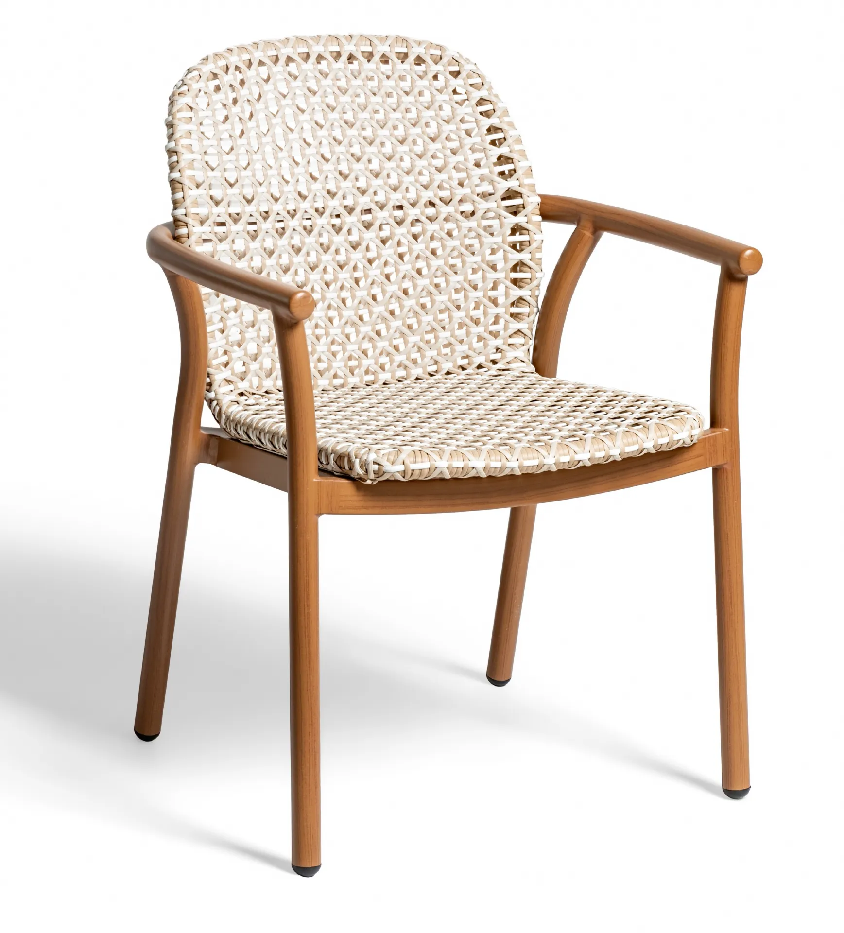 Structure en aluminium verni effet bois, dossier et assise recouverts d'un tressage en PVC.