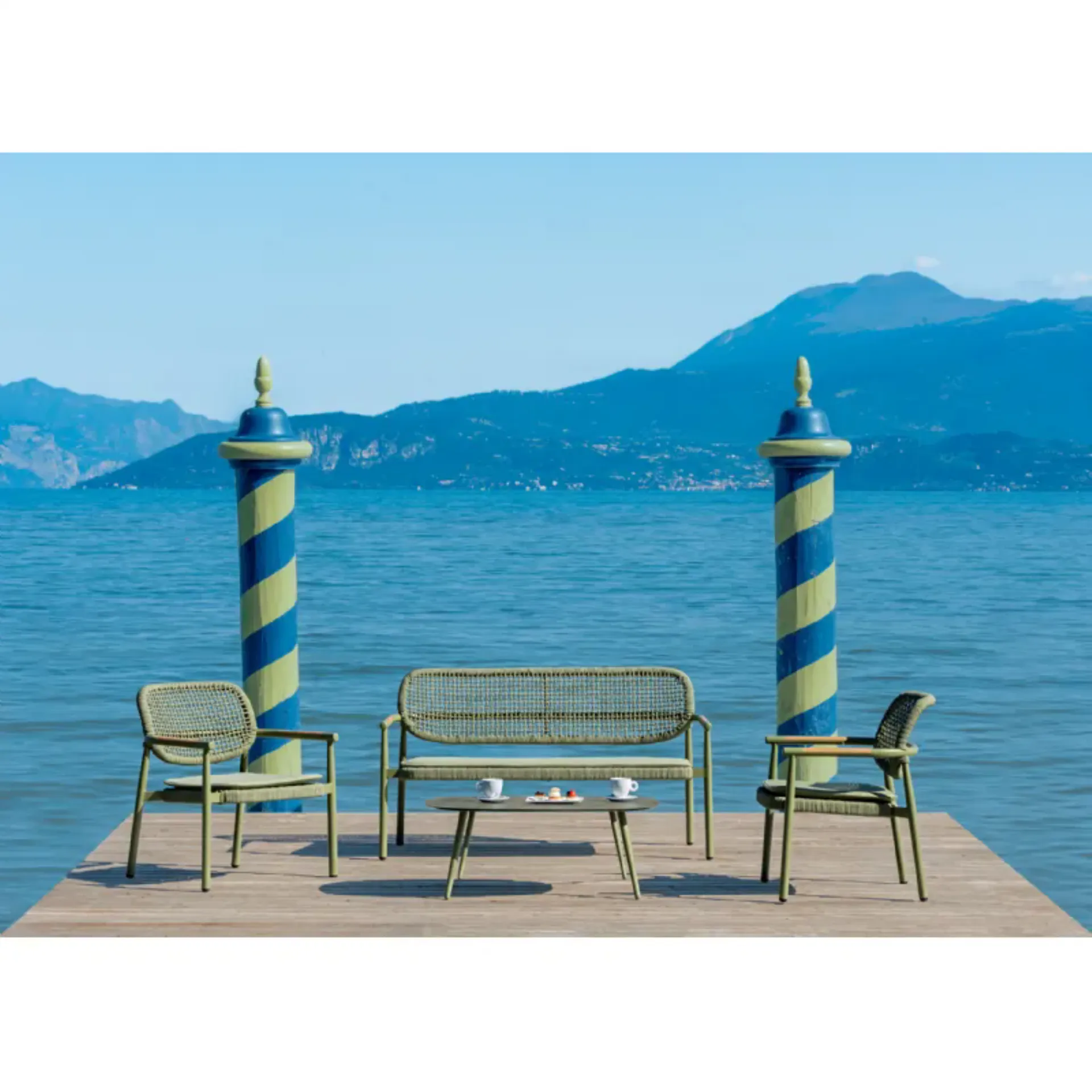 Structure en aluminium verni en poudre de polyester, dossier et assise recouverts de corde synthétique tressée à la main. Les coussins sont en tissu 100% polyester, déhoussable. Inserts sur les accoudoirs en Tech-no Wood.